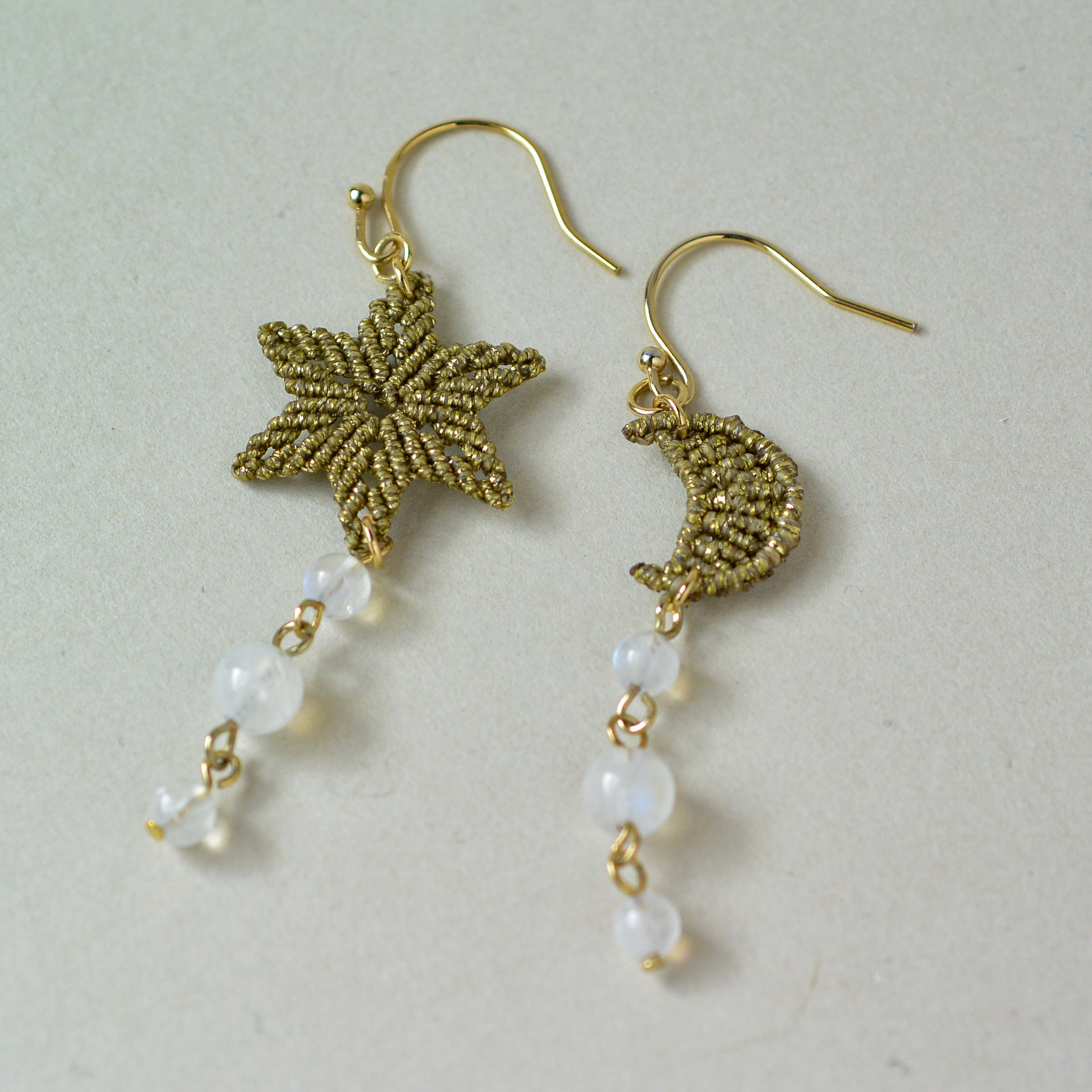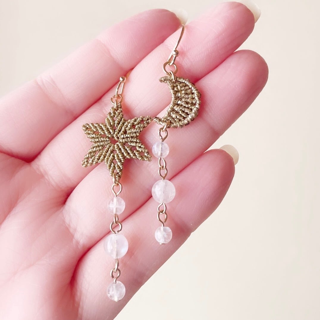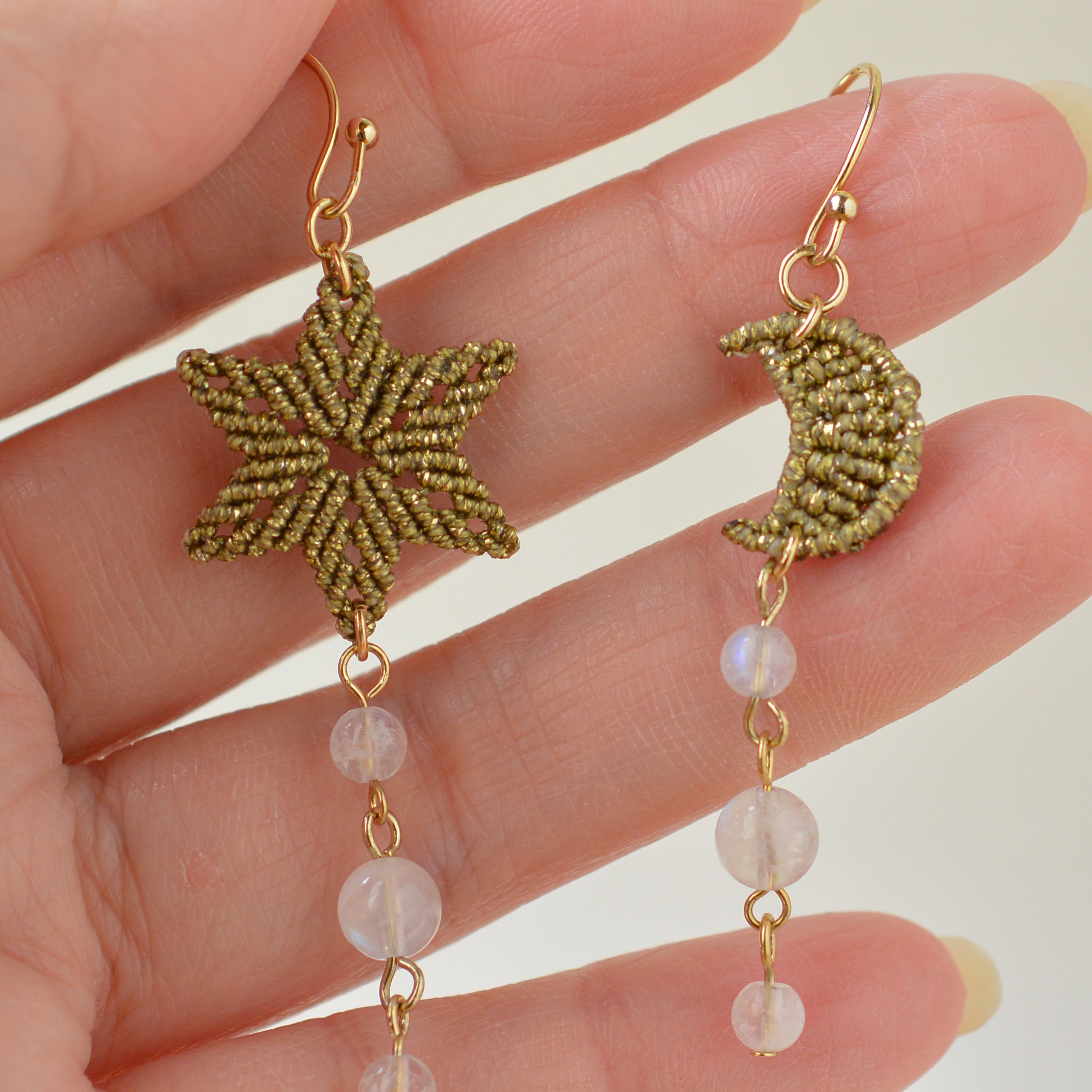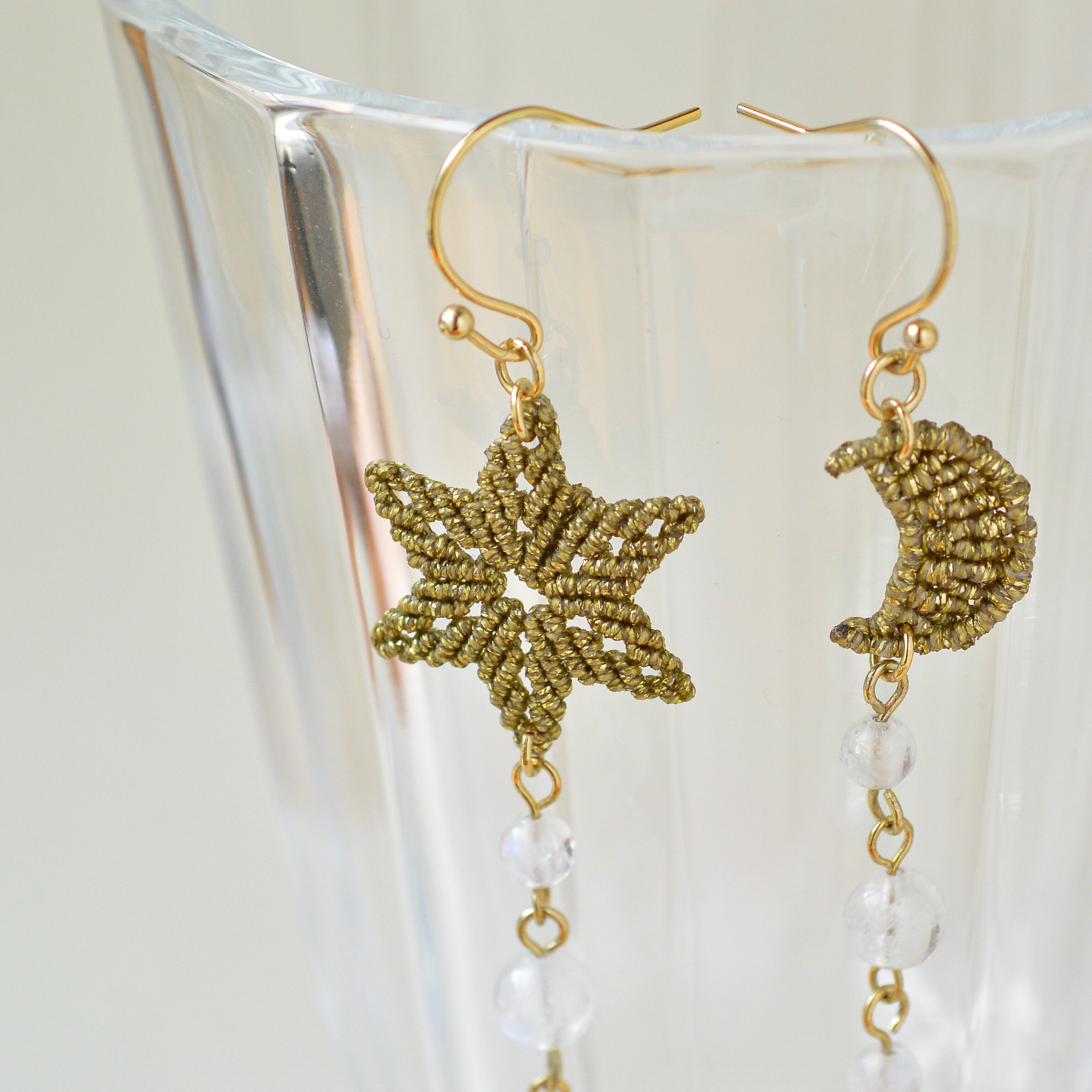 星と月をモチーフにした、アシンメトリーなマクラメピアスです。