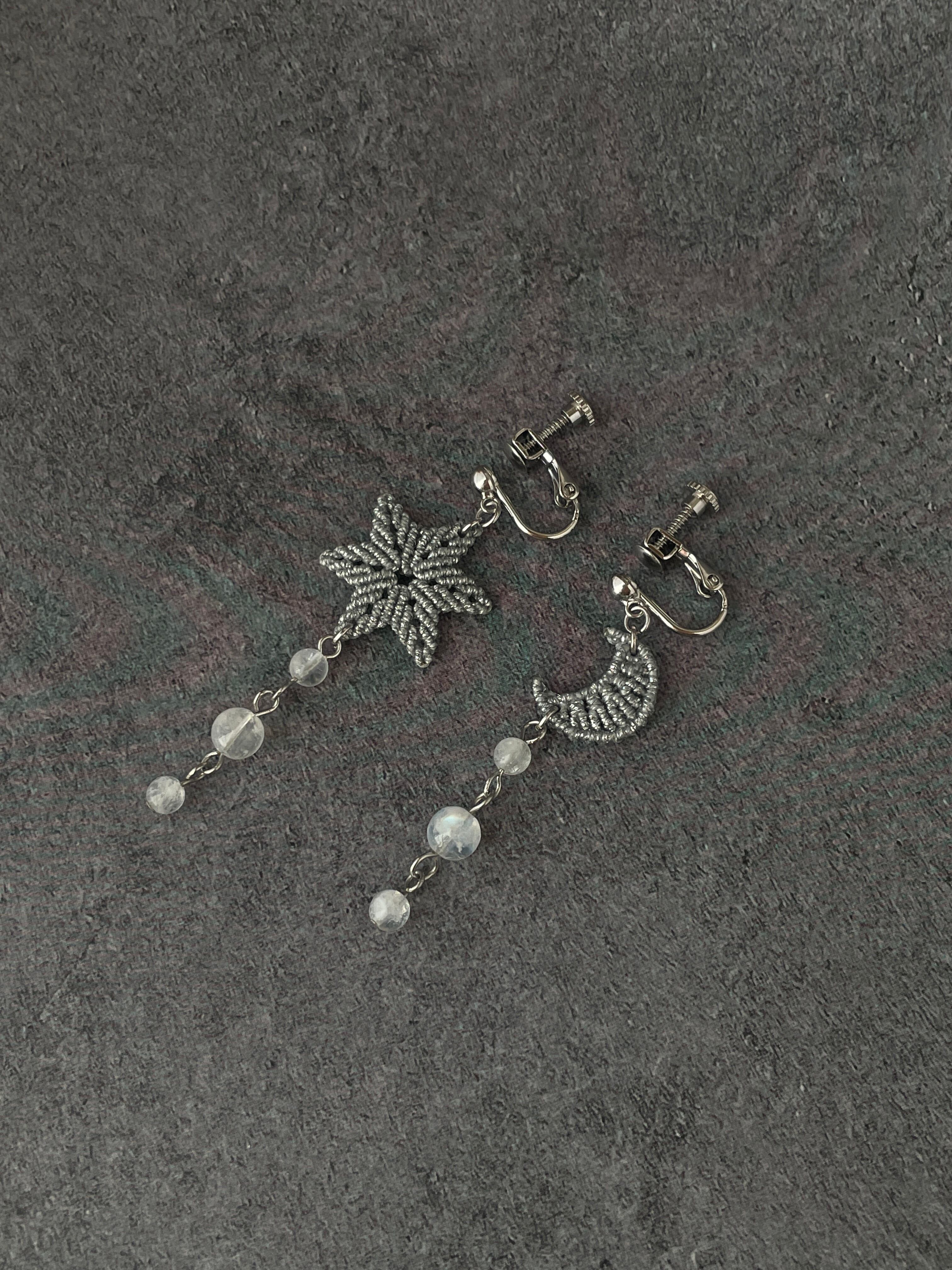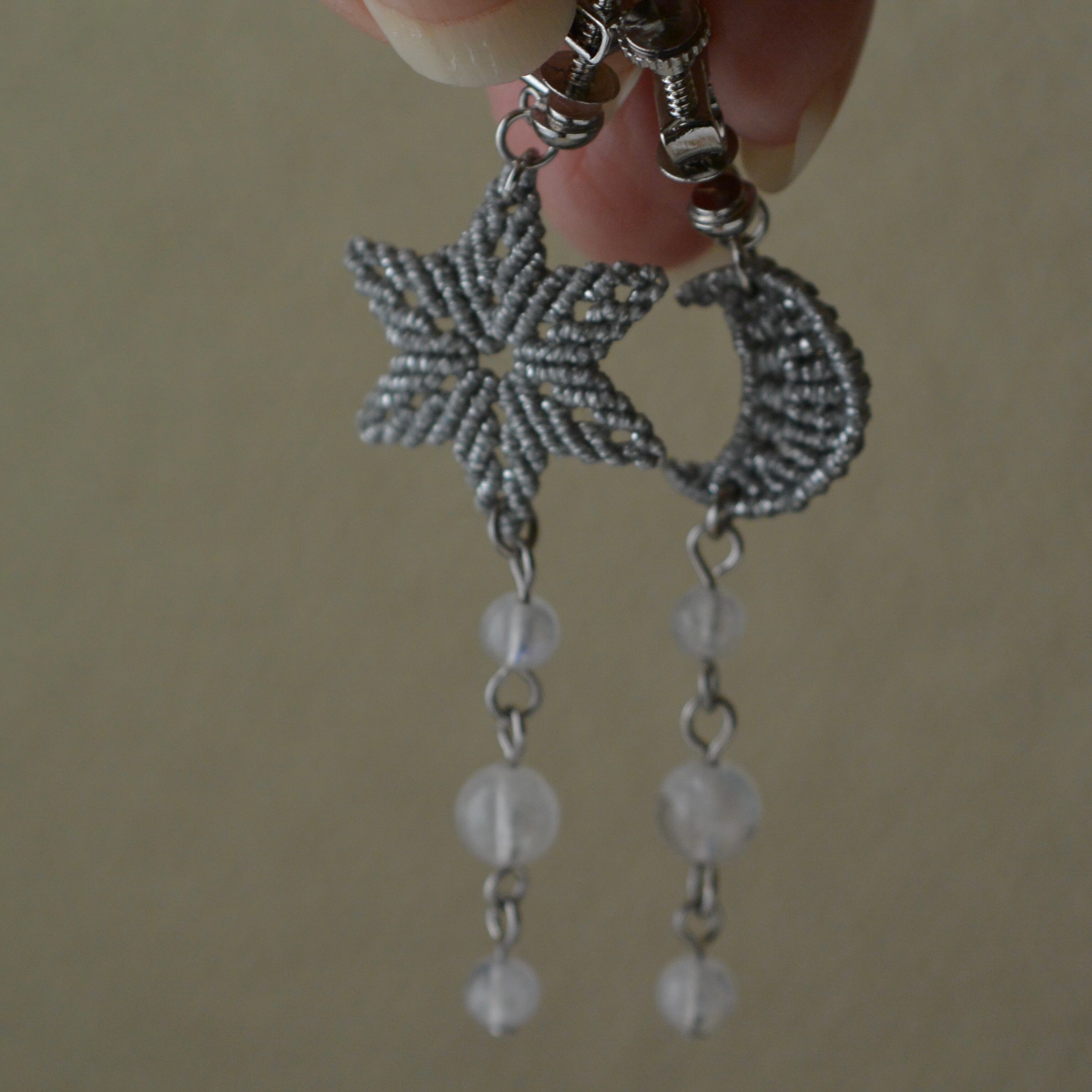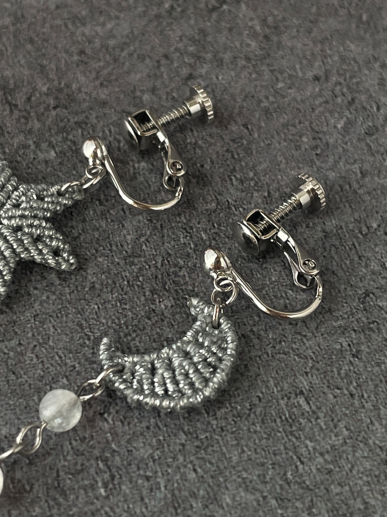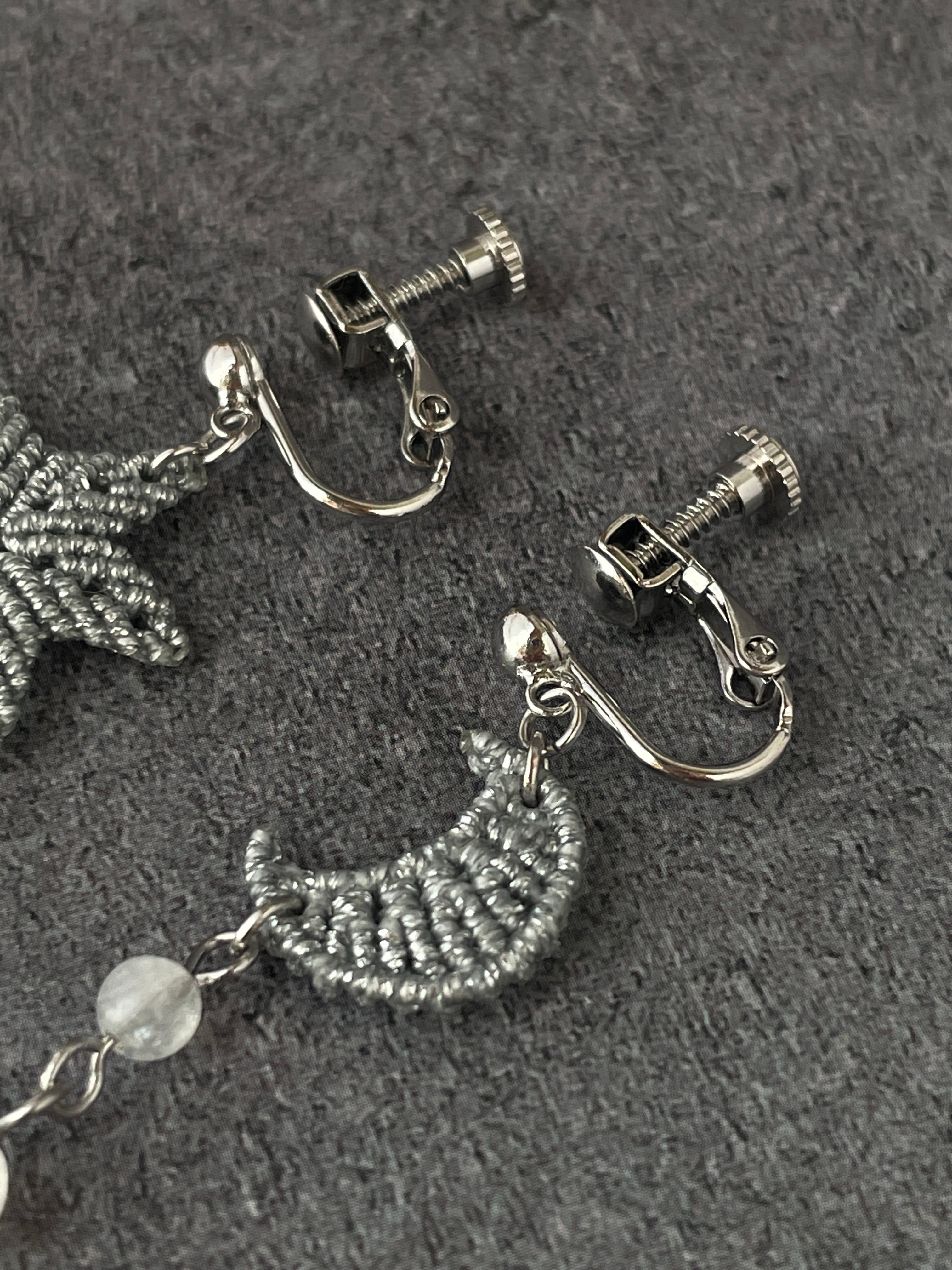 星と月をモチーフにした、アシンメトリーなマクラメピアスです。