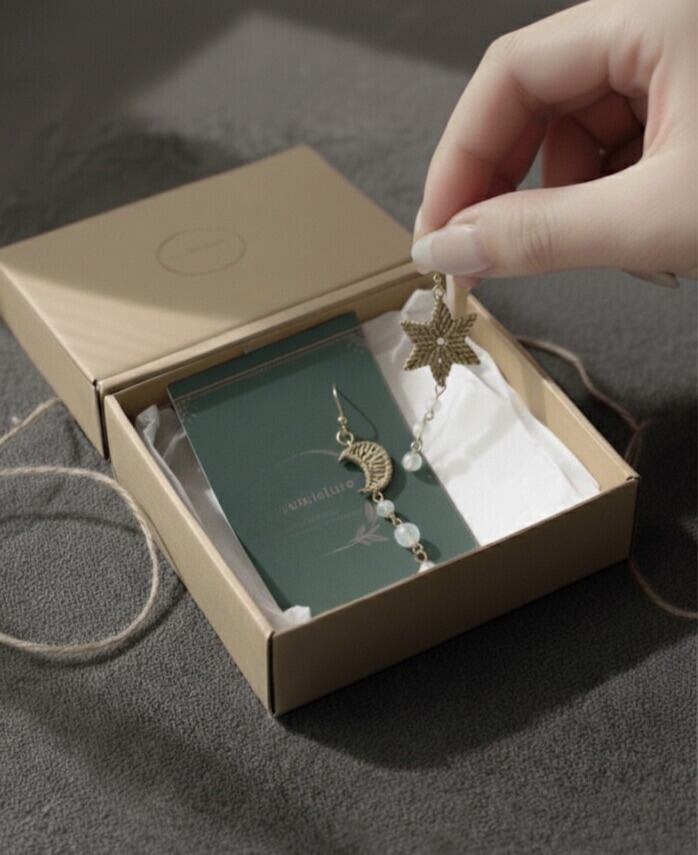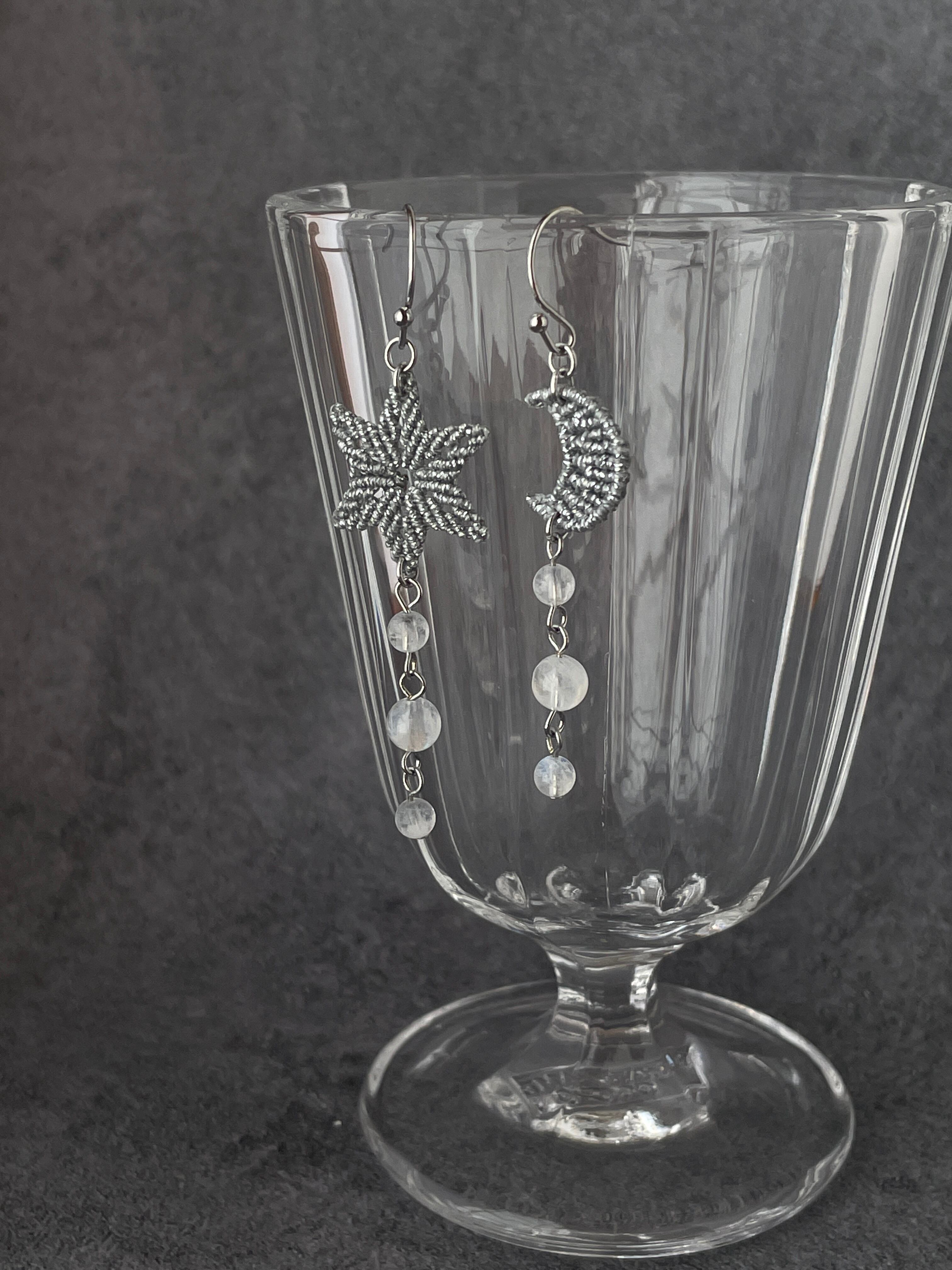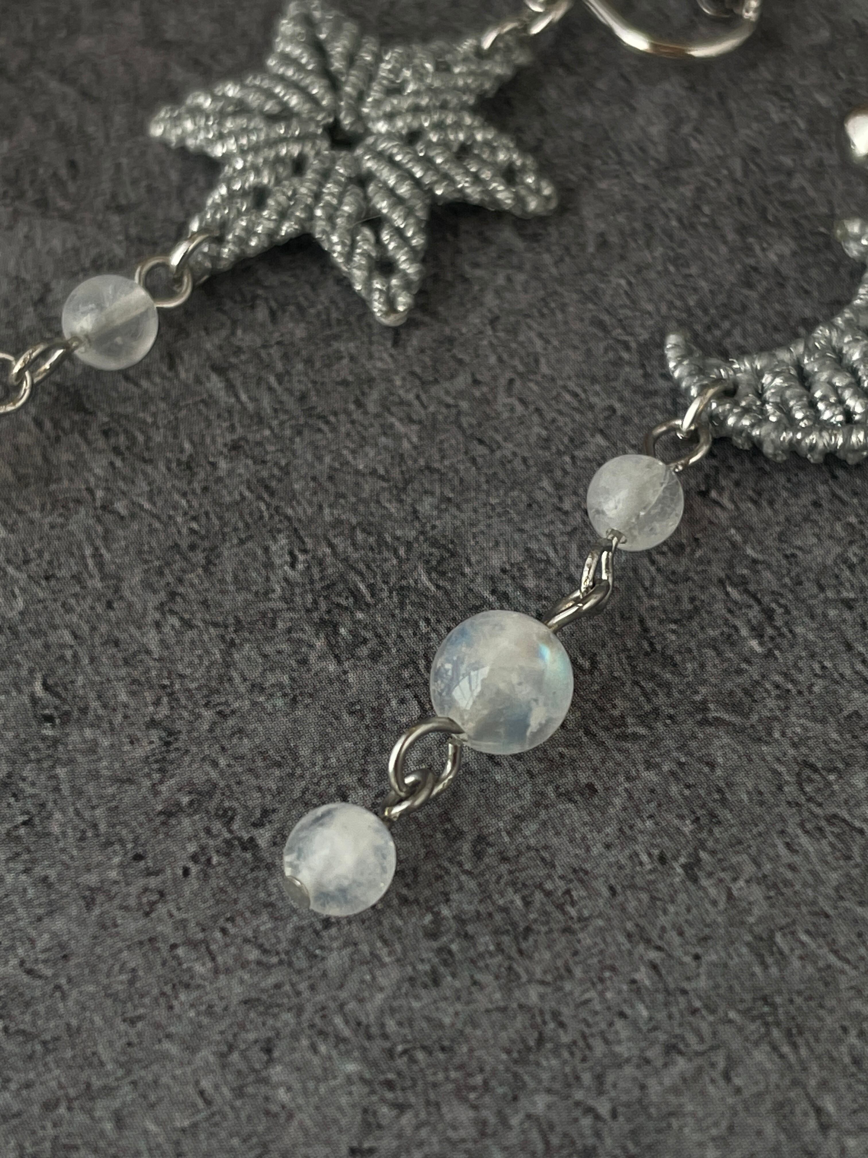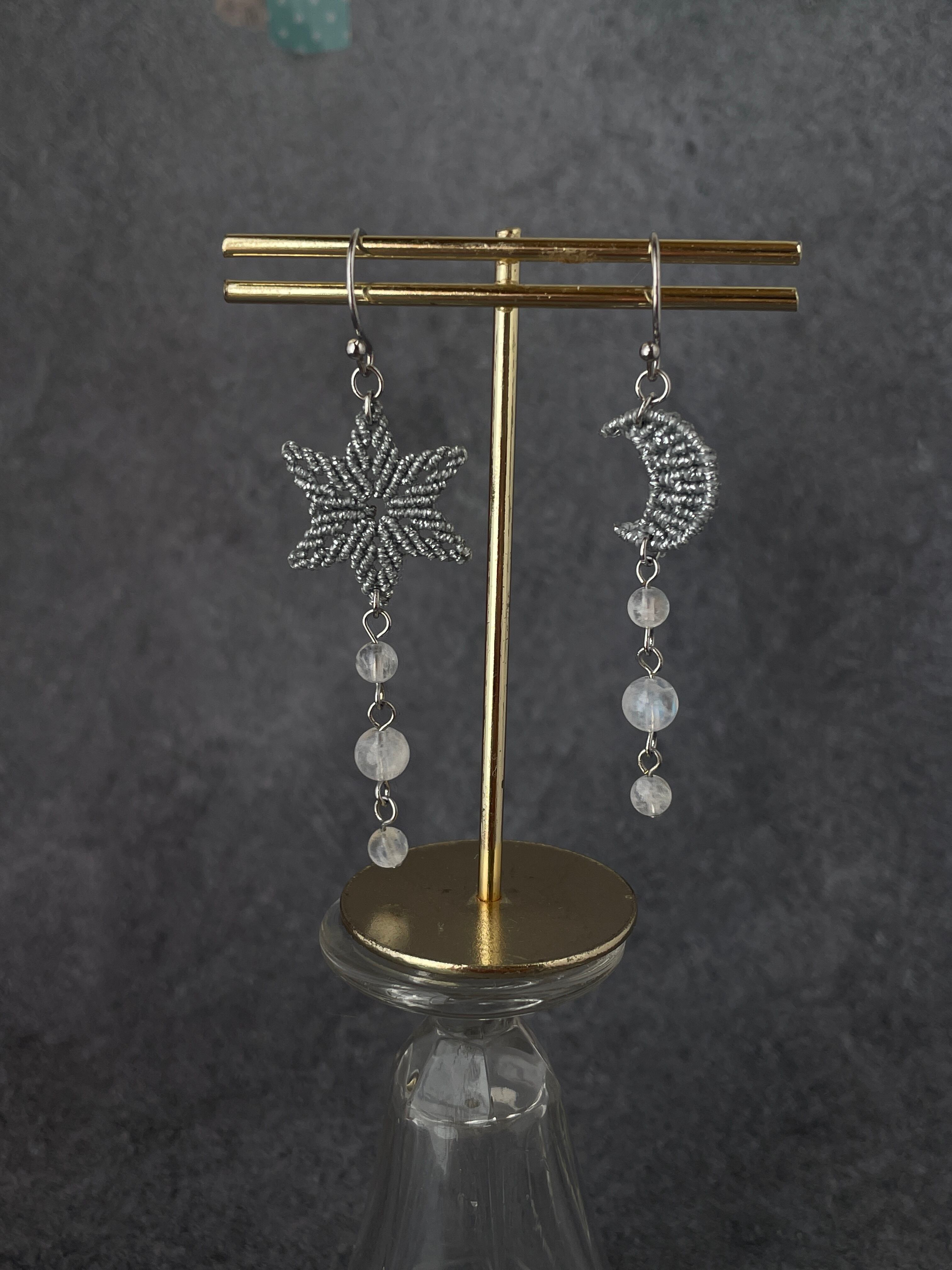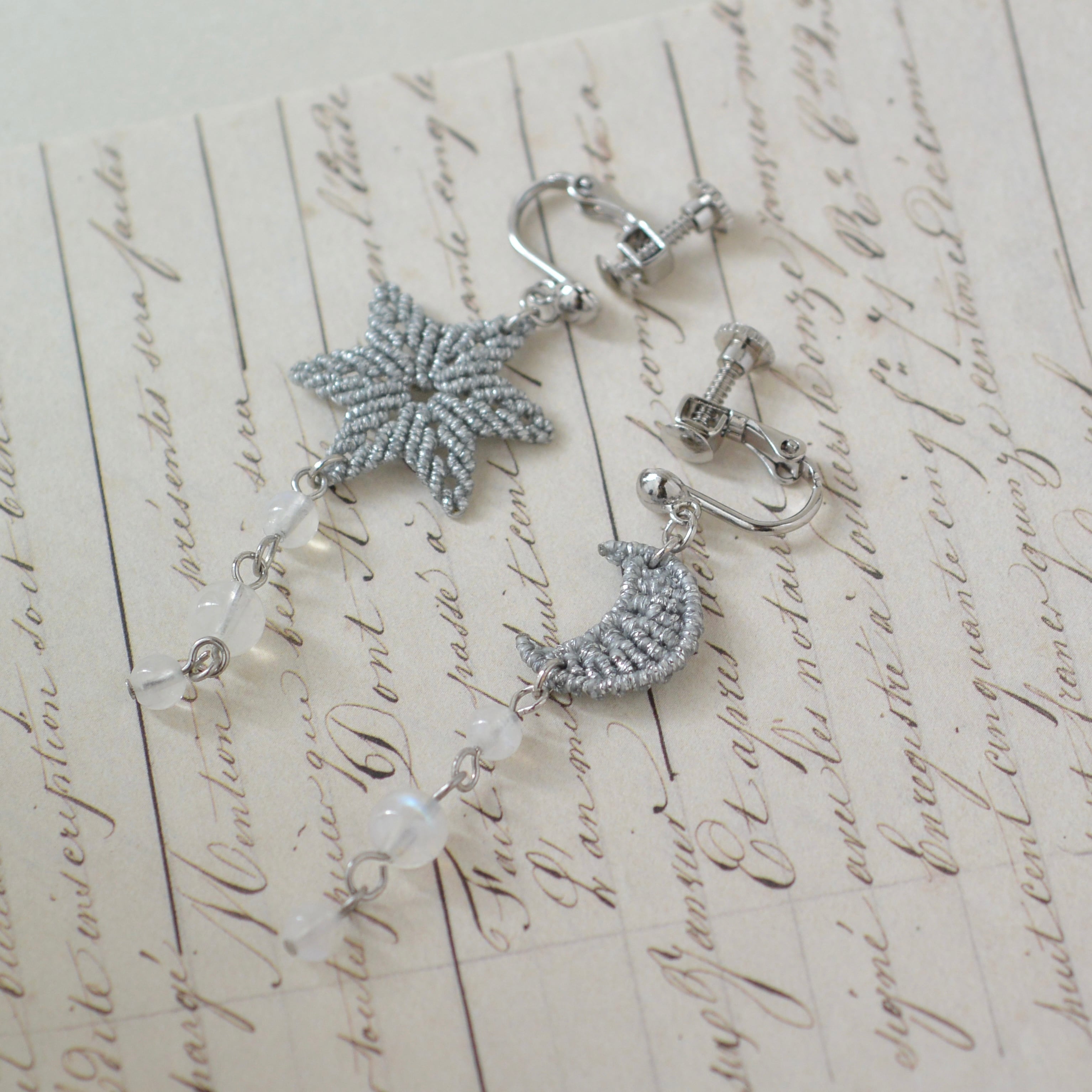 星と月をモチーフにした、アシンメトリーなマクラメピアスです。