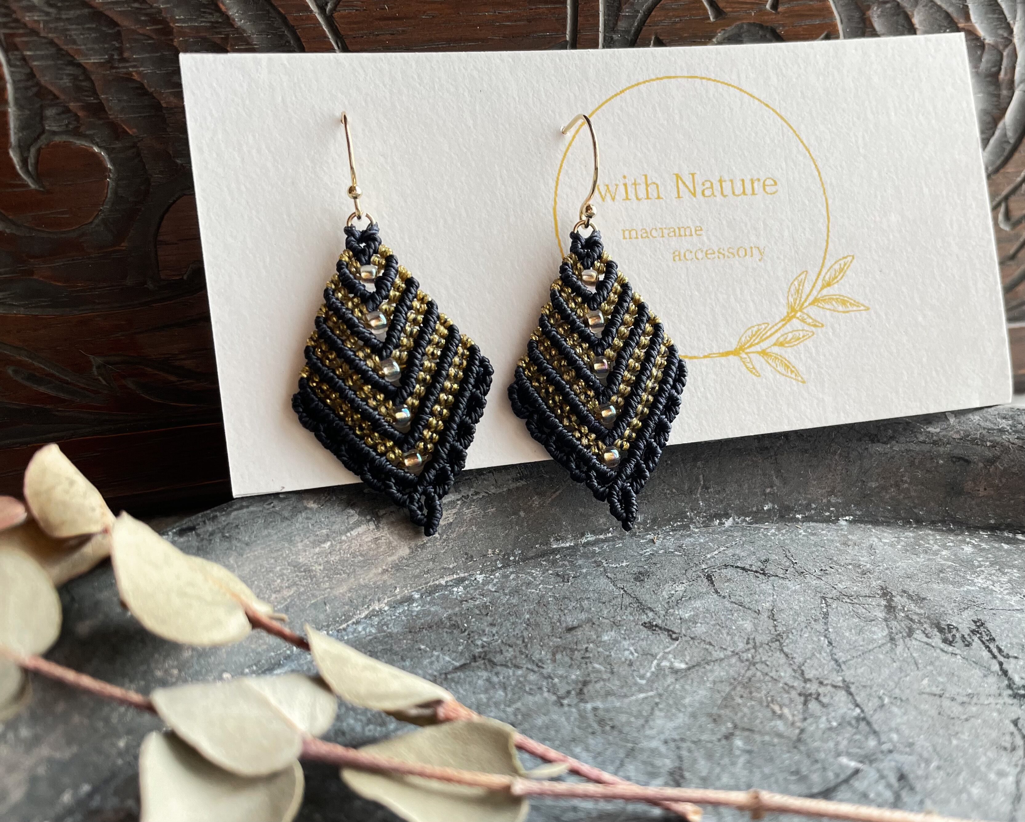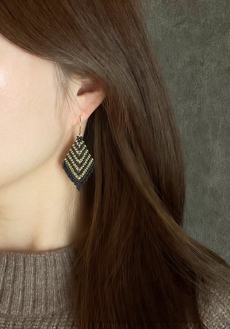 ネイビー色の糸と、ゴールド色の糸で、シードビーズを編み込んだエスニック系デザインのマクラメ編みピアスです。