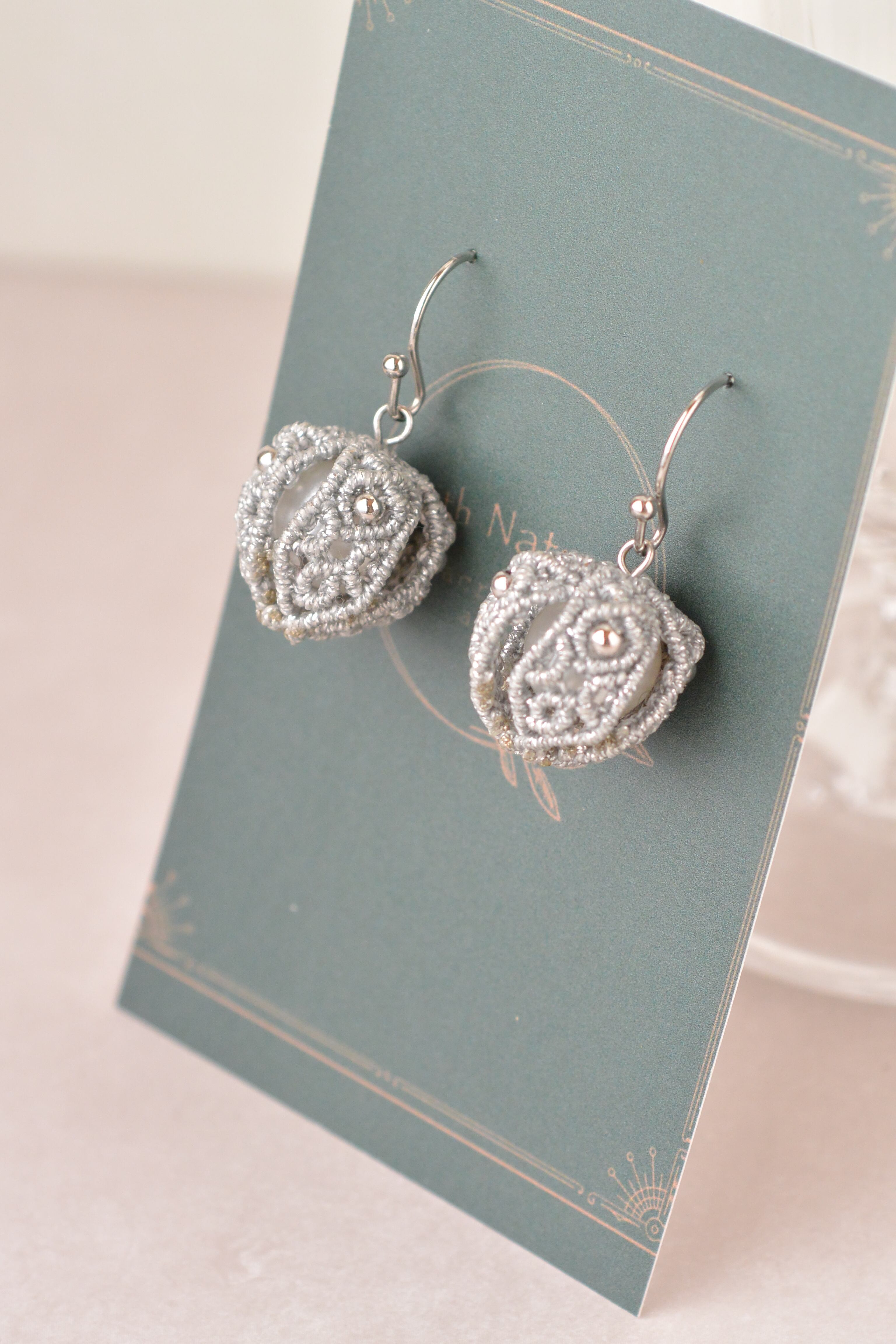 銀色の極細糸で3枚の羽を編み、パールを鬼灯の実の部分に見立てた鬼灯ピアスです。